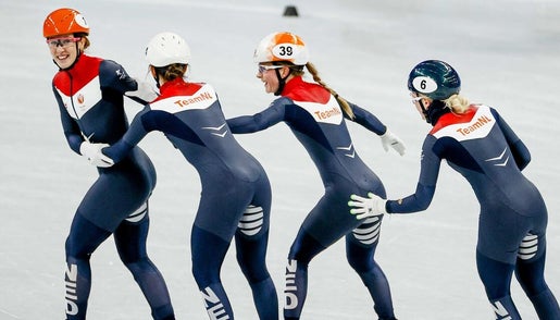 Goud was er bij het vrouwenshorttrack in de aflossing, Zondag 13 februari won het Oranjekwartet Suzanne Schulting, Yara van Kerkhof, Xandra Velzeboer en Selma Poulsen de race met overmacht. Hieronder links ontknoping en rechts het feestvieren na afloop.
