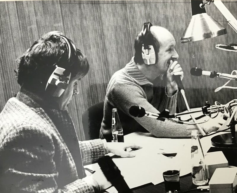 Hierboven rechts ben ik op pad met de nagra. Een loodzwaar opnameapparaat, maar het geluid was prima. Ik deed voornamelijk bureauredactie, maar soms ging ik de studio uit voor interviews op lokatie.