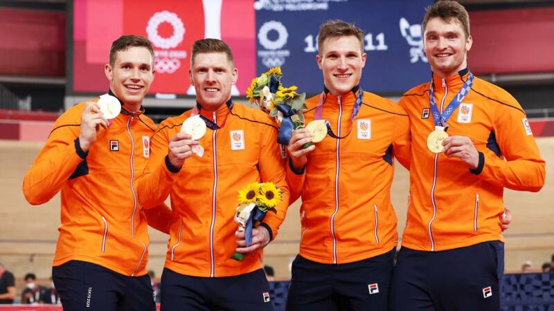 Het zesde goud voor Team NL was binnen op de tweede dinsdag van de Spelen. Toen wonnen de baanwielrenners in de teamsprint goud door Groot-Britannie in de finale met ruim verschil te verslaan. Je ziet ze hiernaast linksmet hun plakken. Van links af: Harry Lavreijssen, Roy van den Berg, Jeffrey Hoogland en Matthijs Buchli. Ze waren de huizenhoge favoriet en ook enkele sconden sneller dan de Britten. Hieronder hun race, eerst de reclame.